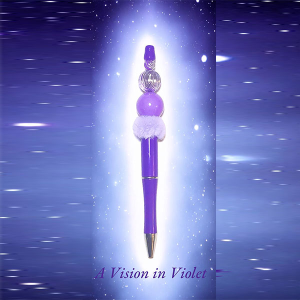 The Vision in Violet pen transforms everyday writing into a magical experience. This eye-catching writing instrument showcases a sleek purple barrel complemented by a unique decorative top featuring four distinct ornaments: a small purple cap, a swirled glass-like sphere, a vibrant purple orb, and a white fluffy pom-pom accent.