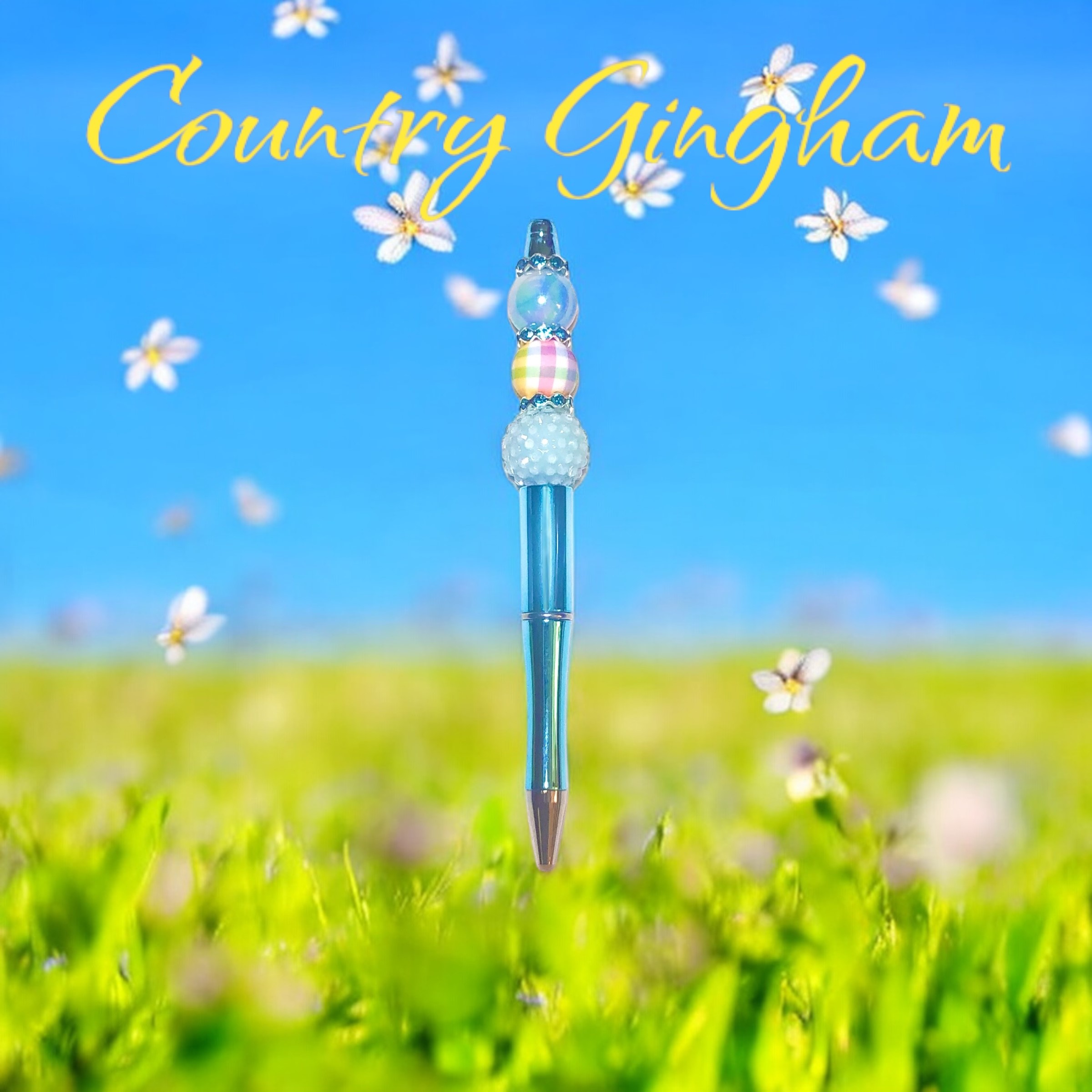 Introducing the Country Gingham pen, a charming item featuring delicate blue tones, pearl-textured beads, and a faint iridescent accent. It is elegant yet uncomplicated, ideal for bringing some personality to your writing.