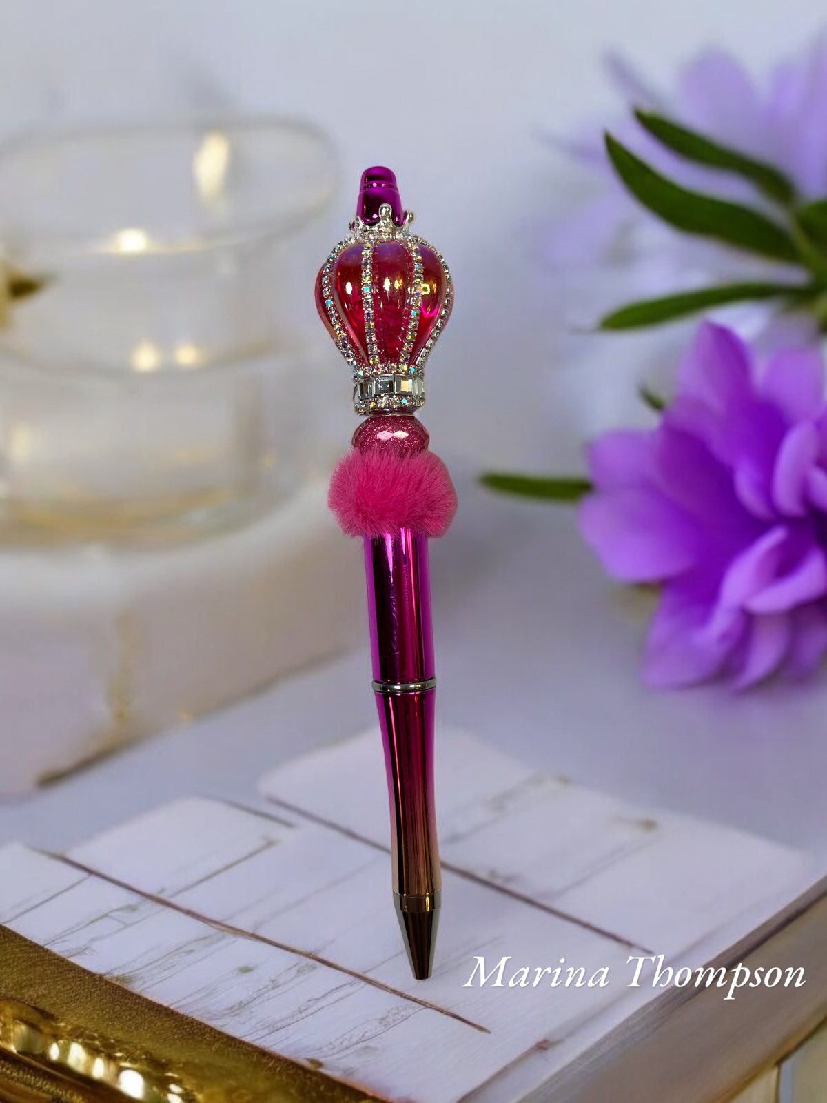 The Marina Thompson pen is a striking symbol of grace and confidence. Its shimmering, metallic pink barrel radiates bold beauty, while the crown-shaped topper, encrusted with dazzling gems, adds a touch of royal flair.