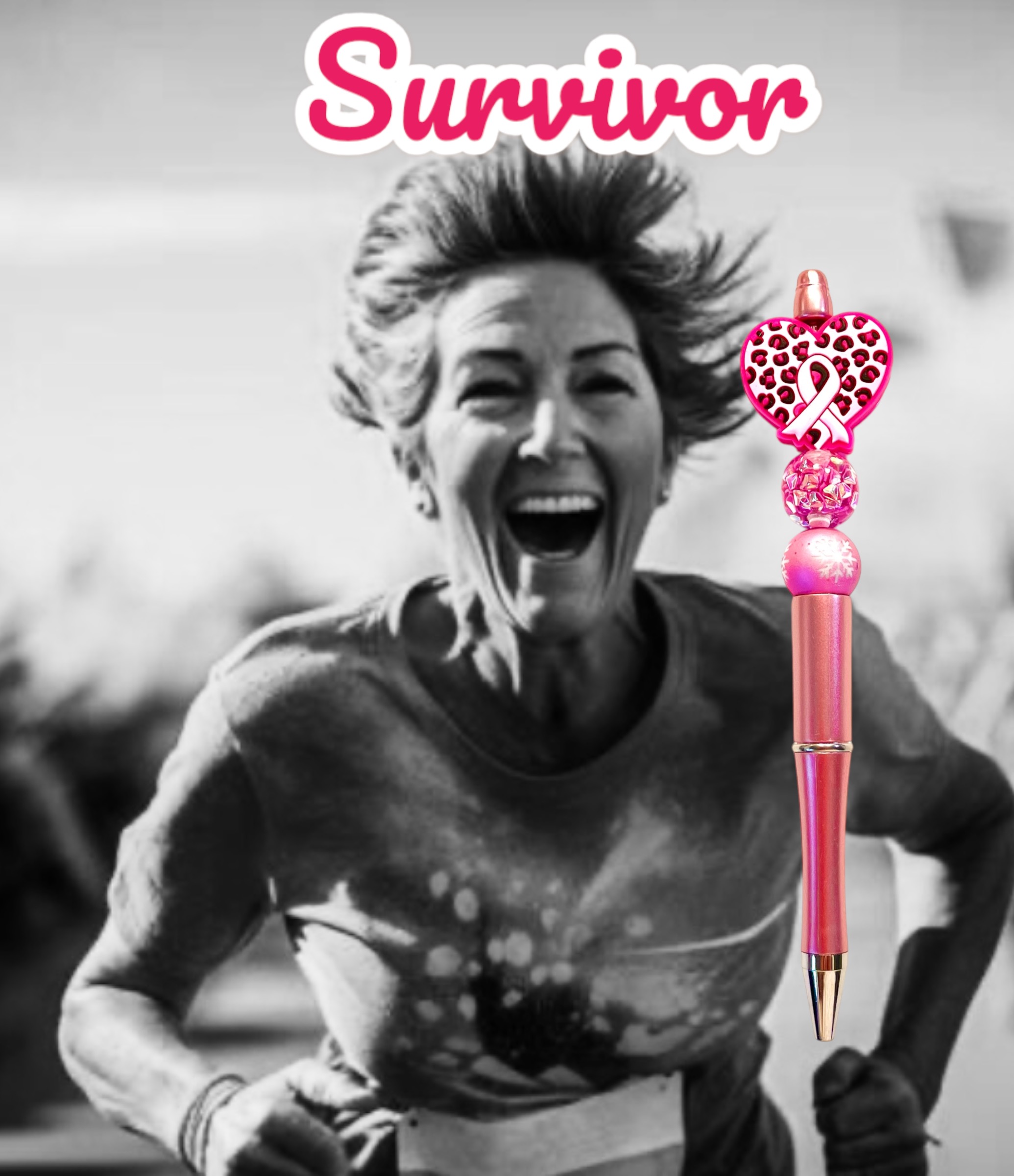 It has a striking heart charm on top that proudly shows off a pink ribbon, representing hope and strength. Two glittering beads add to its allure, one with a gentle snowflake design and the other with a crystal-like sheen. This pen reminds you of your inner warrior and is ideal for meaningful letters or daily notes.